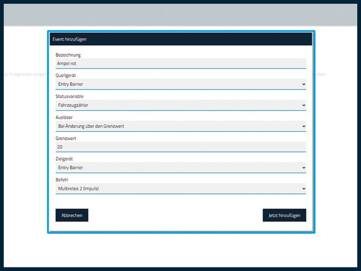 Durch definierte Regeln lässt sich festlegen, dass eine Statusänderung einer Schranke automatisch eine Aktion bei einer anderen auslöst. Zum Beispiel wenn der Fahrzeugzähler einer Schranke einen Grenzwert erreicht hat ein Multi-Relay für eine ROT-Ampel zu schalten. Die Ereignissteuerung ermöglicht so einen logikbasierten Ablauf – ohne manuelles Eingreifen.