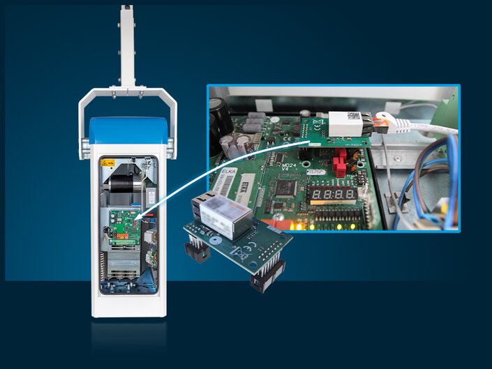 Das IoT-Portal-Modul lässt sich unkompliziert auf jede Schranke mit der Motorsteuerung MO24 aufstecken und ermöglicht so eine nachträgliche Integration in das IoT-Portal.