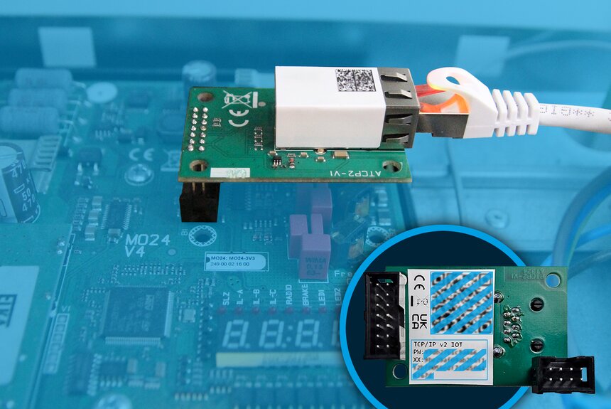 Sie haben sich im Portal angemeldet und Ihr Zugang wurde von uns freigeschaltet. Um nun die Verbindung zum EJOIN IoT-Portal herzustellen, stecken Sie einfach das kompakte TCP-IP-Modul auf die Schrankensteuerung und stellen Sie eine Netzwerkverbindung her.